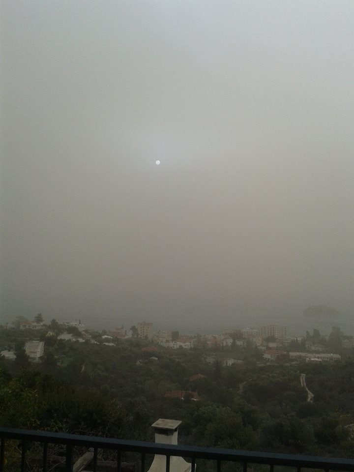 Χαρακτηριστικές είναι και οι φωτογραφίες από το Τολό. Η μεταφορά Αφρικανικής σκόνης από τους ισχυρούς νοτιάδες είχε ως αποτέλεσμα να κρυφτεί ο ήλιος.