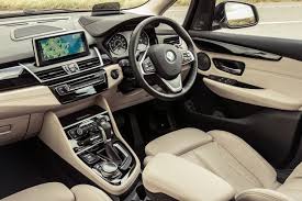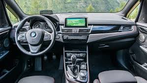Παρά τις πολύ συμπαγείς εξωτερικές διαστάσεις το εσωτερικό είναι φωτεινό και εντυπωσιακά ευρύχωρο. Το οριζόντιας διάταξης ταμπλό όπως και των πάνελ των θυρών χαρίζουν στην καμπίνα μία κομψή και ανάλαφρη αίσθηση και παράλληλα δίνουν έμφαση στην ευρυχωρία. Η οδηγοκεντρική σχεδίαση του cockpit υπογραμμίζει το σπορ χαρακτήρα της νέας BMW Σειρά 2 Active Tourer. Σημειώνεται ότι η BMW Σειρά 2 Active Tourer είναι το πρώτο μοντέλο στην premium μικρή κατηγορία που διατίθεται με Head-Up Display, η οποία προβάλλει όλες τις σχετικές οδηγικές πληροφορίες στο πεδίο ορατότητας του οδηγού έγχρωμα. Αντί του παρμπρίζ, οι πληροφορίες προβάλλονται σε μία οθόνη μεταξύ τιμονιού και παρμπρίζ. Έτσι ο οδηγός μπορεί να βλέπει όλες τις βασικές πληροφορίες χωρίς η προσοχή του να διασπάται από το δρόμο. Η υψηλή ποιότητα του εσωτερικού αναβαθμίζεται ακόμη περισσότερο με μία high-tech κεντρική οθόνη πληροφοριών που «αιωρείται» στο πεδίο ορατότητας του οδηγού. Οι μεγάλες επιφάνειες του ταμπλό με λωρίδες και γαλβανιζέ ένθετα δίνουν έμφαση στον premium χαρακτήρα του αυτοκινήτου, ενώ το ίδιο σχεδιαστικό θέμα μεταφέρεται στην κεντρική κονσόλα και τις πόρτες. Για πρώτη φορά τα χειριστήρια HVAC και ο γαλβανιζέ διακόπτης Driving Experience Control τοποθετούνται στην κεντρική κονσόλα. Ο ευέλικτος χώρος αποσκευών, με χωρητικότητα που μπορεί να αυξηθεί από 468 σε 1.510 L, και τα διαιρούμενα 40:20:40 /αναδιπλούμενα πίσω καθίσματα που προσφέρονται στάνταρ αποτελούν δείγμα άριστης καθημερινής πρακτικότητας. Το αναδιπλούμενο πάτωμα του χώρου αποσκευών κρύβει έναν αποθηκευτικό χώρο με ένα πρακτικό πολύ-λειτουργικό ράφι. Η ευελιξία αυξάνεται περαιτέρω με ένα συρόμενο πίσω κάθισμα, που επιτρέπει την αύξηση της περιοχής των ποδιών ή του χώρου αποσκευών, ανάλογα με τις απαιτήσεις.