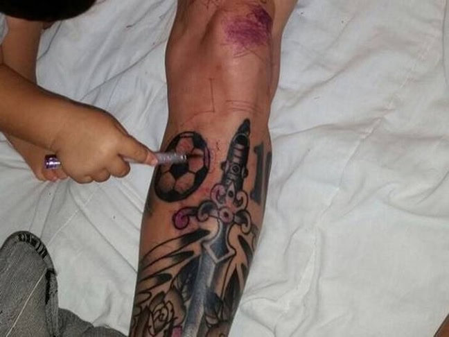 Το πιο ακριβό αριστερό πόδι φιλοτεχνείται από ένα τατουάζ που αποτελείται από ένα ξίφος περιτριγυρισμένο από τριαντάφυλλα, μια μπάλα και τον αριθμό «10».
