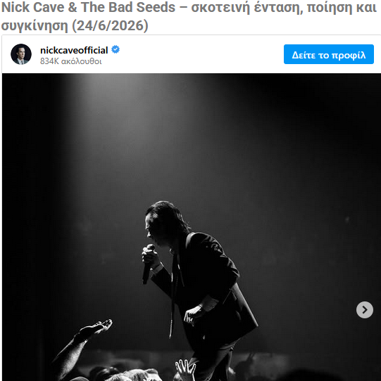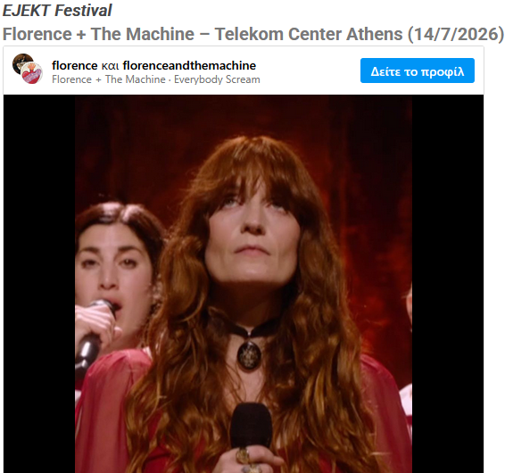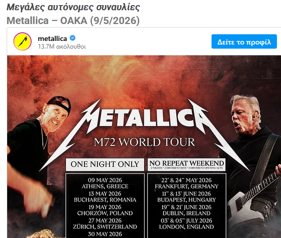 Αθήνα: Οι δυνατές συναυλίες του 2026 που δεν πρέπει να χάσεις 15/01/202615/01/2026Takis K. Δυνατά live στην Αθήνα ερχονται μέσα στο 2026. Με συναυλίες σε ΟΑΚΑ, Πλατεία Νερού, Λυκαβηττό και ΚΠΙΣΝ. Δείτε επίσης:Ο Λευτέρης Πετρούνιας έλαβε μέρος σε απρόσμενο σόου σε τσίρκο και καταχειροκροτήθηκεΝεκροί 3 σκιέρ στις Άλπεις από χιονοστιβάδεςCINEMA info: Πρόταση / Marty Supreme (trailer)Η νέα φρεγάτα Belharra «Κίμων» στα ελληνικά ύδατα (vd)Χρυσές Σφαίρες 2026: Δείτε τους νικητές - Όλα όσα έγινανΟι αργίες του 2026