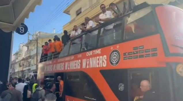 Ο Μιχάλης Μπούσης ήταν όρθιος στην οροφή που πούλμαν και πανηγύριζε εκστασιασμένος με την κούπα στα χέρια, ενώ ο αρχηγός της ομάδας, Βασίλης Λαμπρόπουλος έκλεψε την παράσταση, φορώντας τους πανηγυρισμούς μία μάσκα του… Captain America.